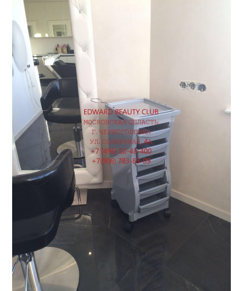 Тележка парикмахерская выполнена из пластика, на колесиках, с выдвижными ящиками. Цвет: черный, серый.