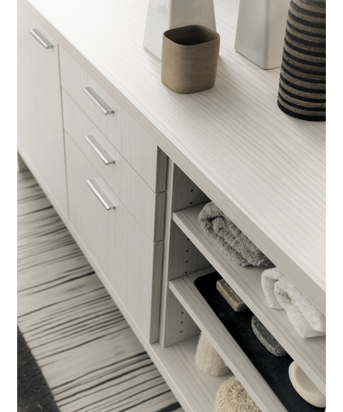 Наиболее укомплектованная модель из серии «ET-NO». Она представляет собой предмет мебели с двойной дверью с автоматическим доводчиком и хромированными ручками, а также тремя самозакрывающимися выдвижными ящиками. Дополнительно в комплектацию может входить раковина белого цвета с хромированным смесителем. Доступно несколько вариантов исполнения мебели – белая лиственница и натуральный венге. Каждый из цветов смотрится гармонично, благородно и универсально. Также покупатель может самостоятельно выбрать тип ножек – деревянные или из хромированной стали.