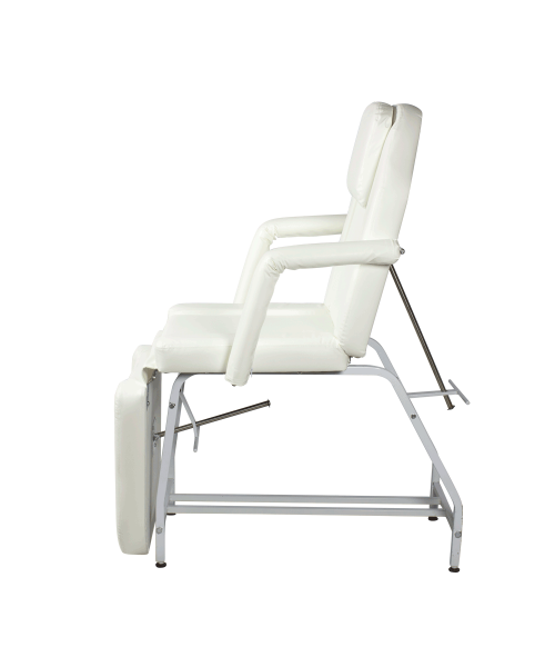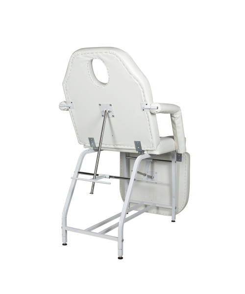 Косметологическое кресло "МД-14" разработано для проведения косметологических и массажных процедур. Оно имеет прочный металлический каркас на устойчивых ножках с подпятниками. С помощью механической регулировки положения спинки и мягкого элемента под ноги кресло раскладывается в горизонтальное положение. На спинке есть отверстие для лица, которое закрывается съемной подушкой-подголовником. Для удобства клиентов данная модель комплектуется парой мягких съемных подлокотников.