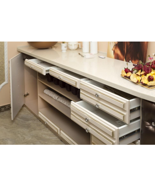 Лаборатория оборудована удобными открытыми полками и выдвижными ящиками и может быть дополнена мойкой из нержавеющей стали. Данный предмет интерьера позволит поместить все необходимые средства для работы наиболее оптимальным способом.